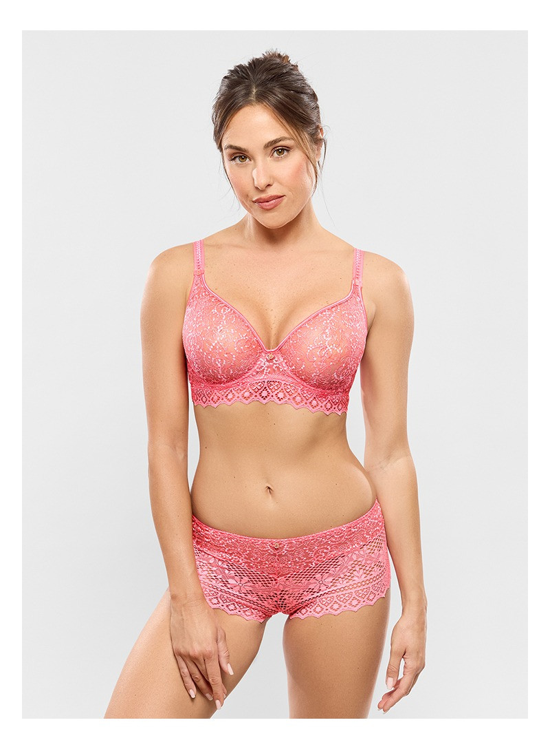 De Cassiopee naadloze beugel BH van Empreinte is uitgevoerd in de kleur Electric Pink. Deze roze semi-transparante BH heeft naadloze cups en zijn verrijkt met prachtige broderie, die onzichtbaar blijft onder strakke kleding. Dankzij de unieke u-vorm beugel, ontwikkeld door Empreinte, zorgt deze BH voor een mooi smal silhouet onder je kleding. De Cassiopee BH heeft daarnaast een breed rugpand en iets bredere schouderbandjes, wat zorgt voor extra comfort. Het bredere rugpand biedt bovendien extra ondersteuning. Tussen de cups is een elegant bedeltje verwerkt! Combineer deze BH met een van de bijpassende slips voor een complete look.