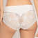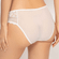 De Cassiopee shorty van Empreinte is uitgevoerd in de kleur Silk. Deze witte semi-transparante short is verrijkt met prachtig Frans broderie en kantwerk. Dit shortje is aan de achterkant zo afgewerkt dat het niet zichtbaar is onder strakke kleding. De stof is heerlijk soepel en zacht. Het voorpand van het shortje heeft een zilverkleurig bedeltje.