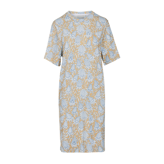 Het Keira Fela nachtjurkje is uitgevoerd in de kleur Sahara Sun. Dit zachte nachthemd met korte mouwen is voorzien van een bloemenprint van lichtblauwe en gele tinten. Het pyjamajurkje valt lekker oversized door de boxy fit. Het nachtjurkje is gemaakt van het duurzame materiaal EcoVero. De stof is lekker zacht en heeft een lichte glans.