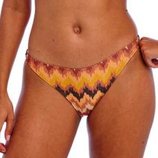 Het Arizona Wave lage bikinibroekje van Freya Swim is uitgevoerd in de kleur Coast Line. De blauwe tinten geven het ontwerp een frisse, zomerse uitstraling. De stof is afgewerkt met metallic garen die zorgen voor een subtiele glans. Het bikinibroekje biedt een flatterende pasvorm en zit wat lager op de heupen voor een vrouwelijke en speelse look. De goudkleurige ringdetails aan de zijkanten geven het broekje een luxe finishing touch. Combineer met een bijpassende bikinitop.